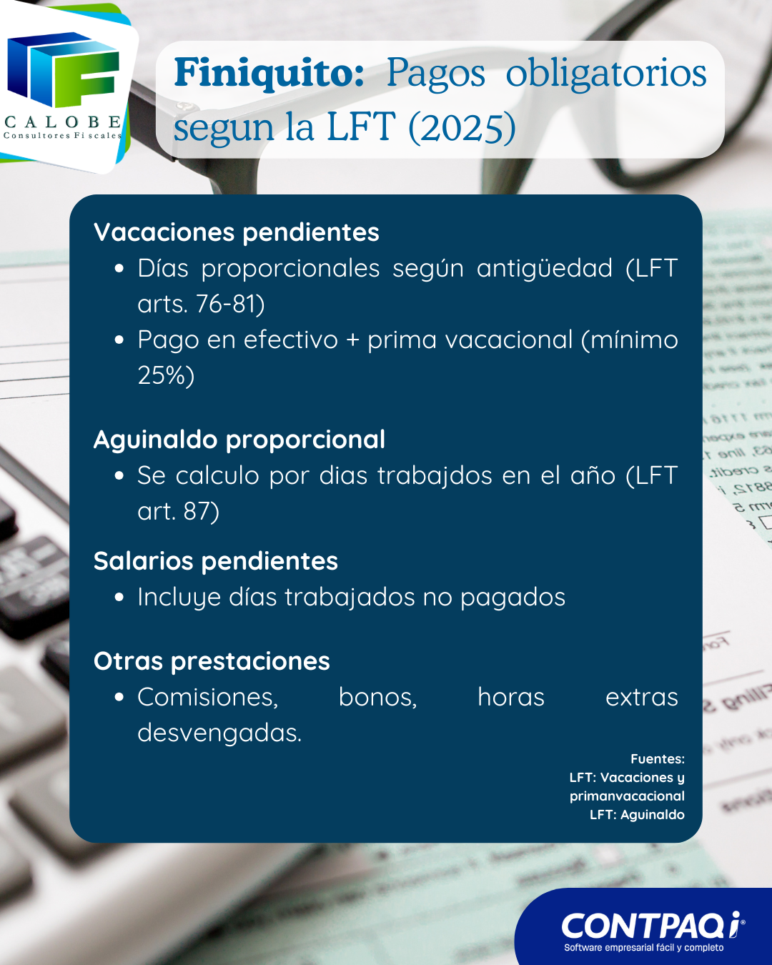 El finiquito en 2025 se calcula sumando salario pendiente, vacaciones y prima vacacional no disfrutadas, aguinaldo proporcional y demás prestaciones devengadas, menos las deducciones legales correspondientes.