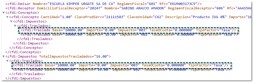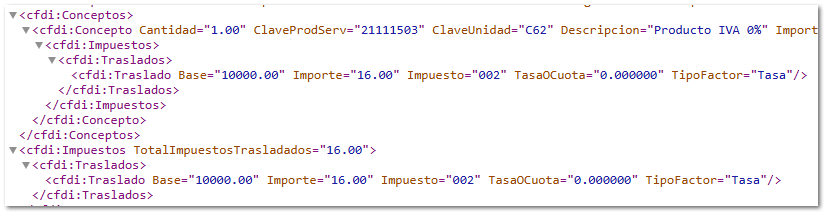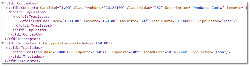 a. Dentro del subnodo <Impuestos> del nodo <Conceptos>, se mostrará la información de los atributos de la siguiente manera: