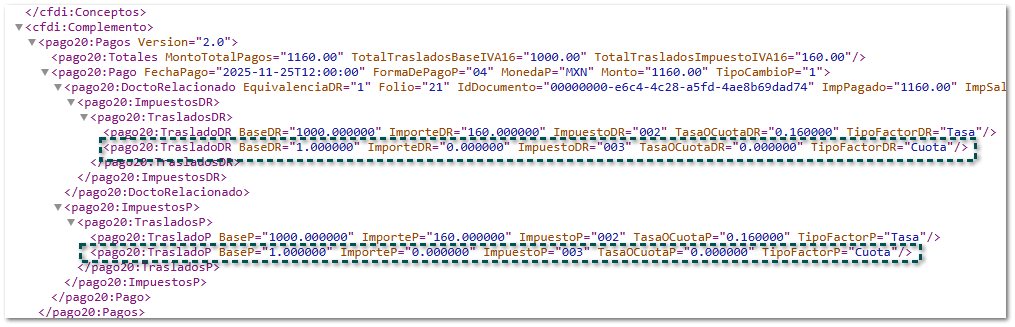 Al momento de timbrar documentos de Pago los cuales estén saldando Facturas que contengan movimientos con diferentes IEPS y éstas hayan «Desglosado el IEPS», se considerará lo siguiente: